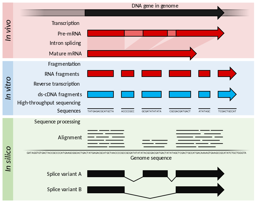 Within the organisms, genes are transcribed and spliced (in eukaryotes) to produce mature mRNA transcripts (red). The mRNA is extracted from the organism, fragmented and copied into stable ds-cDNA (blue). The ds-cDNA is sequenced using high-throughput, short-read sequencing methods. These sequences can then be aligned to a reference genome sequence to reconstruct which genome regions were being transcribed. This data can be used to annotate where expressed genes are, their relative expression levels, and any alternative splice variants.