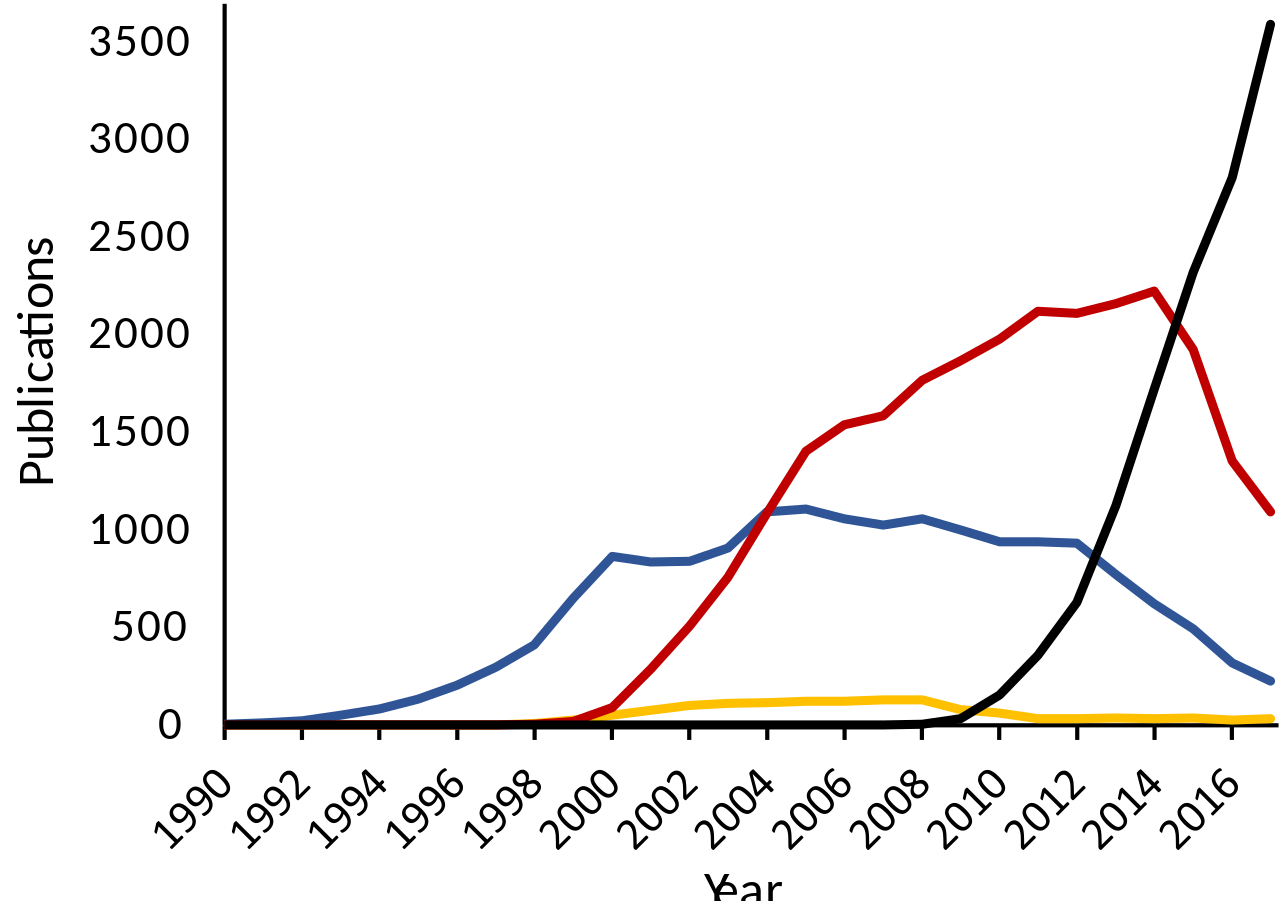 Transcriptomics method use over time. Published papers referring to RNA-Seq (black), RNA microarray (red), expressed sequence tag (blue) and serial/cap analysis of gene expression (yellow) since 1990.