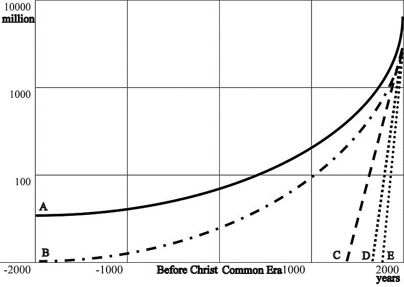 Aworld human population → 7 billion; B – number of literate persons; C – number of reading books (with beginning of printing); D – number of receivers (radio, TV); E – number of phones, computers, Internet users.