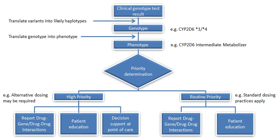 An overall process of how pharmacogenomics functions in a clinical practice. From the raw genotype results, this is then translated to the physical trait, the phenotype. Based on these observations, optimal dosing is evaluated.