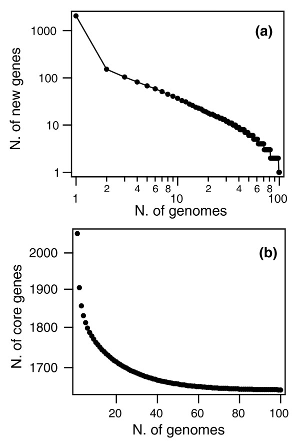 The S. pneumoniae pan-genome. (a) Number of new genes as a function of the number of sequenced genomes. The predicted number of new genes drops sharply to zero when the number of genomes exceeds 50. (b) Number of core genes as a function of the number of sequenced genomes. The number of core genes converges to 1,647 for number of genomes n→∞. From Donati et al.