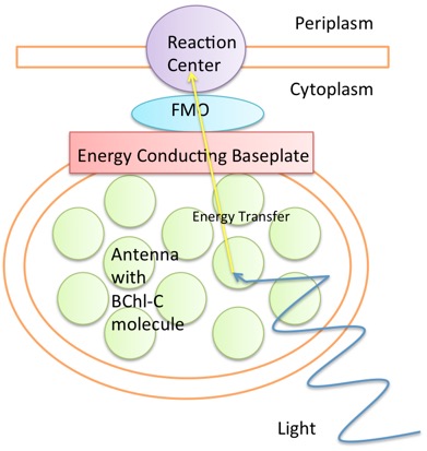 Diagram of FMO complex. Light excites electrons in an antenna. The excitation then transfers through various proteins in the FMO complex to the reaction center to further photosynthesis.
