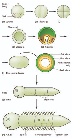 As was mentioned above, evolution has produced a number of the types of multiphasic development, in which the life history involves a succession of larval stages. Such types of development offer the possibility of changing the relative importance of the various stages in relation to the exploitation of resources and reproduction by the species. There are, for instance, many types of animals (particularly insects) in which nearly the whole life history is passed in a larval stage in which most of the feeding and growth of the organism is carried out, the final adult stage being short and used almost entirely for reproduction. Another evolutionary strategy has been to transfer the reproductive phase from the final stage of the life history to some earlier larval stage. This again has occurred in certain insects. If such a process is carried to its logical evolutionary conclusion, the final previously adult stage of the life history may totally disappear, the larval stage of the earlier evolutionary form becoming the adult stage of the later derivative of it. An example in which this process is at least partially accomplished is in the axolotl, a salamander that reproduces in a larval stage and in nature rarely if ever metamorphoses into the adult, but can be persuaded to do so if injected with extra supplies of the hormone thyroxin. It has been suggested that such processes of neoteny (the retention of some juvenile characteristics in adulthood) have played a decisive role in certain earlier phases of evolution, evidence of which is now lost. It has been argued that the whole vertebrate phylum may have originated from modifications of one of the larval stages of an invertebrate group. |