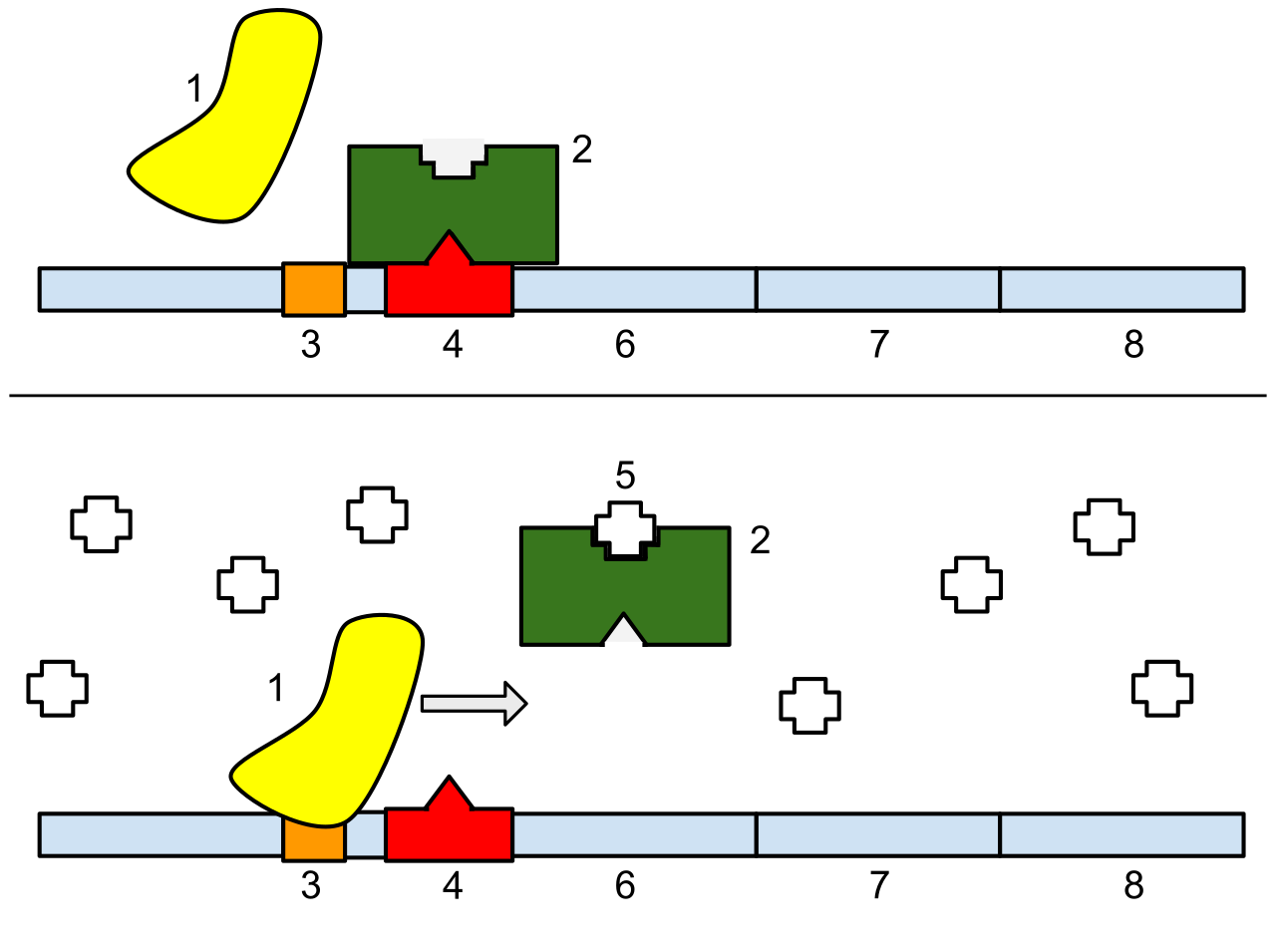 The lac operon. Top: Repressed, Bottom: Active. 1: RNA polymerase, 2: Repressor, 3: Promoter, 4: Operator, 5: Lactose, 6: lacZ, 7: lacY, 8: lacA..