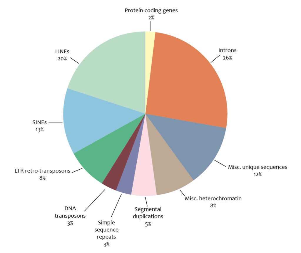 Protein-coding sequences (specifically, coding exons) constitute less than 1.5% of the human genome. In addition, about 26% of the human genome is introns. Aside from genes (exons and introns) and known regulatory sequences (8–20%), the human genome contains regions of noncoding DNA. The exact amount of noncoding DNA that plays a role in cell physiology has been hotly debated. Recent analysis by the ENCODE project indicates that 80% of the entire human genome is either transcribed, binds to regulatory proteins, or is associated with some other biochemical activity.