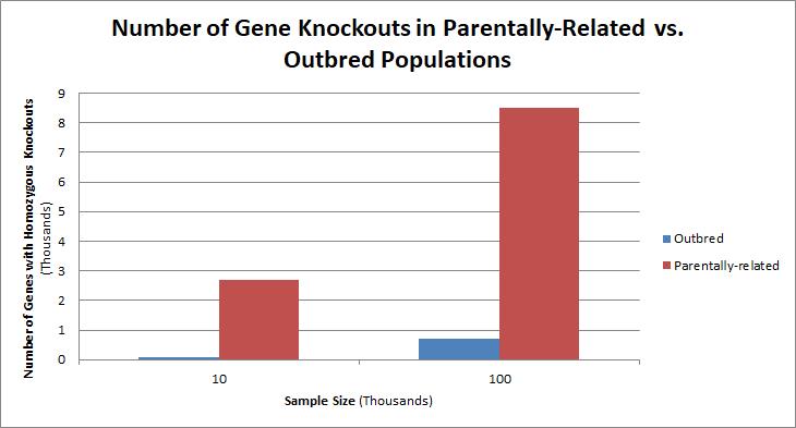 Populations with a high level of parental-relatedness result in a larger number of homozygous gene knockouts as compared to outbred populations. |