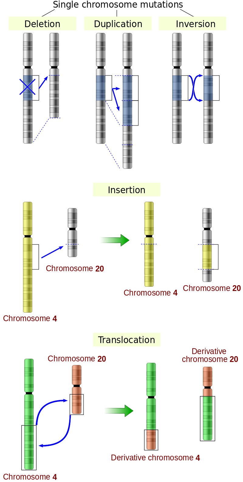 Kromozomal mutasyonlar büyük ölçek silinme, ikileme, evrilme ve yerleşim bozulmalarından oluşur.