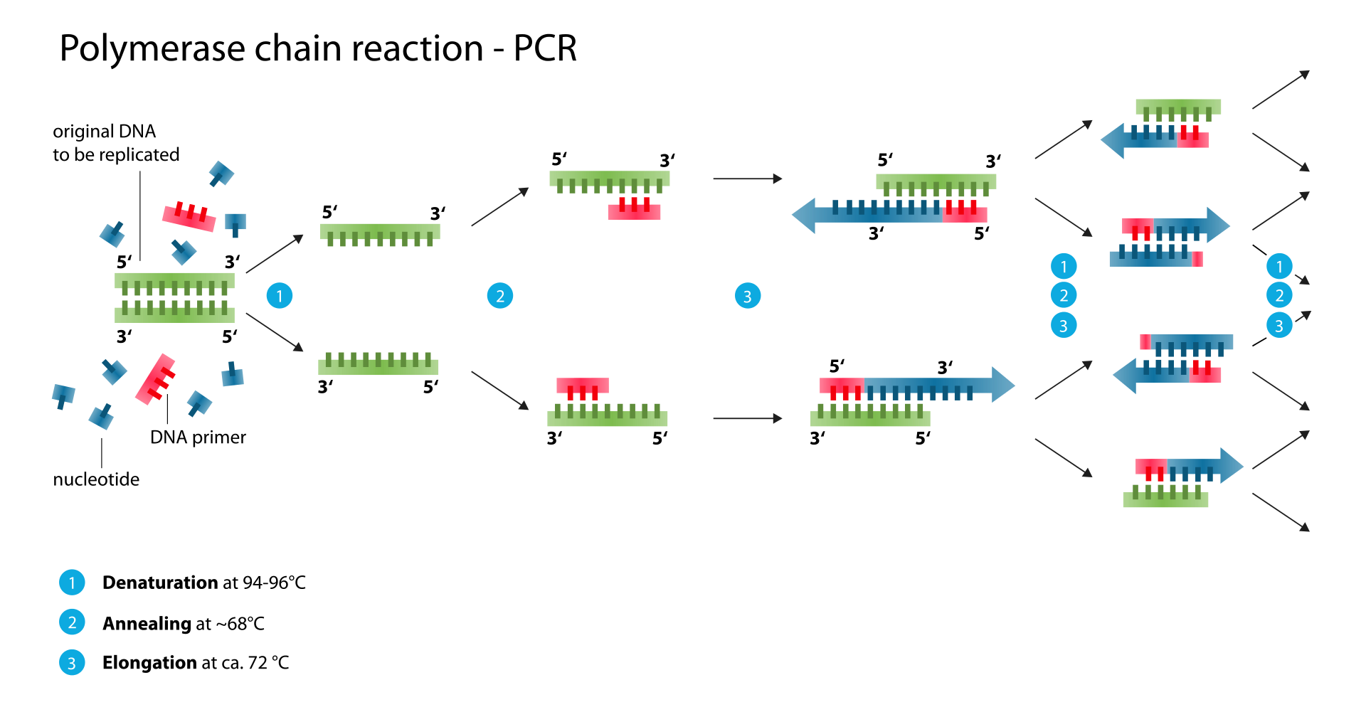 PCR ilerlerken, yaratılan DNAnın kendisi eşlenim için kalıp olarak kullanılır ve tepkimeler zincirinde kökensel DNA kalıbı katlanarak çoğalır.