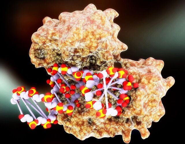 A restriction enzyme is added to the DNA. This enzyme moves along the DNA strand, cutting it at the so-called restriction sites. The restriction sites available to enzymes are located throughout the chromosome except in sections consisting of copies of the core sequence. This process produces many pieces of DNA, which consist of repeats of the core sequence.