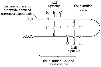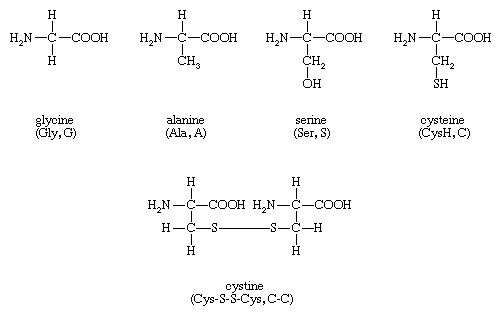 Two amino acids, each containing three carbon atoms, are derived from alanine; they are serine and cysteine. Serine contains an alcohol group (―CH2OH) instead of the methyl group of alanine, and cysteine contains a mercapto group (―CH2SH). Animals can synthesize serine but not cysteine or cystine. Cysteine occurs in proteins predominantly in its oxidized form (oxidation in this sense meaning the removal of hydrogen atoms), called cystine. Cystine consists of two cysteine molecules linked by the disulfide bond (―S―S―) that results when a hydrogen atom is removed from the mercapto group of each of the cysteines. Disulfide bonds are important in protein structure because they allow the linkage of two different parts of a protein molecule to—and thus the formation of loops in—the otherwise straight chains. Some proteins contain small amounts of cysteine with free sulfhydryl (―SH) groups. |