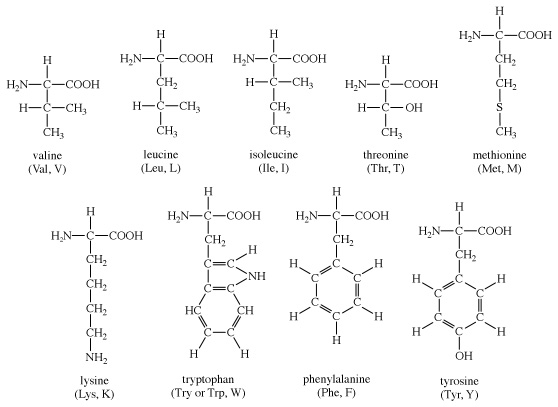 The amino acids present in proteins differ from each other in the structure of their side (R) chains. The simplest amino acid is glycine, in which R is a hydrogen atom. In a number of amino acids, R represents straight or branched carbon chains. One of these amino acids is alanine, in which R is the methyl group (―CH3). Valine, leucine, and isoleucine, with longer R groups, complete the alkyl side-chain series. The alkyl side chains (R groups) of these amino acids are nonpolar; this means that they have no affinity for water but some affinity for each other. Although plants can form all of the alkyl amino acids, animals can synthesize only alanine and glycine; thus valine, leucine, and isoleucine must be supplied in the diet.