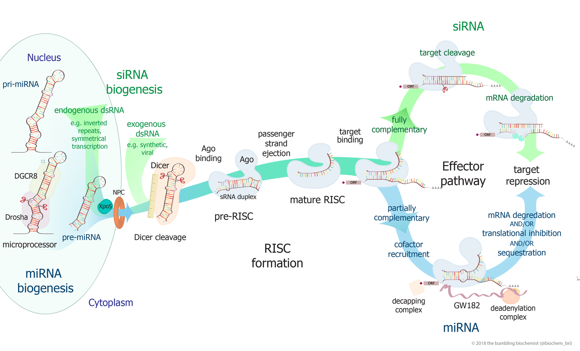 small RNA Biogenesis: primary miRNAs (pri-miRNAs) are transcribed in the nucleus and fold back onto themselves as hairpins that are then trimmed in the nucleus by a microprocessor complex to form a ~60-70nt hairpin pre-RNA. This pre-miRNA is transported through the nuclear pore complex (NPC) into the cytoplasm, where Dicer further trims it to a ~20nt miRNA duplex (pre-siRNAs also enter the pathway at this step). This duplex is then loaded into Ago to form the “pre-RISC(RNA induced silencing complex)” and the passenger strand is released to form active RISC. |