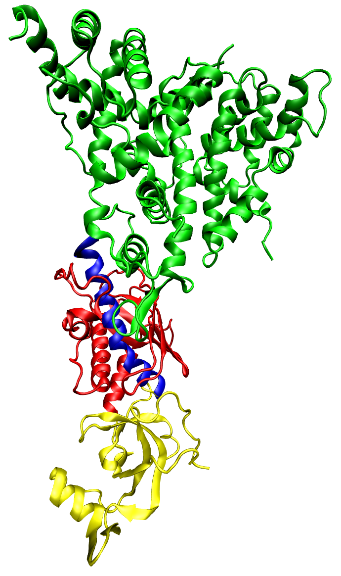 The dicer protein from Giardia intestinalis, which catalyzes the cleavage of dsRNA to siRNAs. The RNase domains are colored green, the PAZ domain yellow, the platform domain red, and the connector helix blue.. |