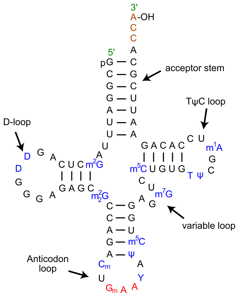 Tertiary structure of tRNA. CCA tail in yellow, Acceptor stem in purple, Variable loop in orange, D arm in red, Anticodon arm in blue with Anticodon in black, T arm in green.. |