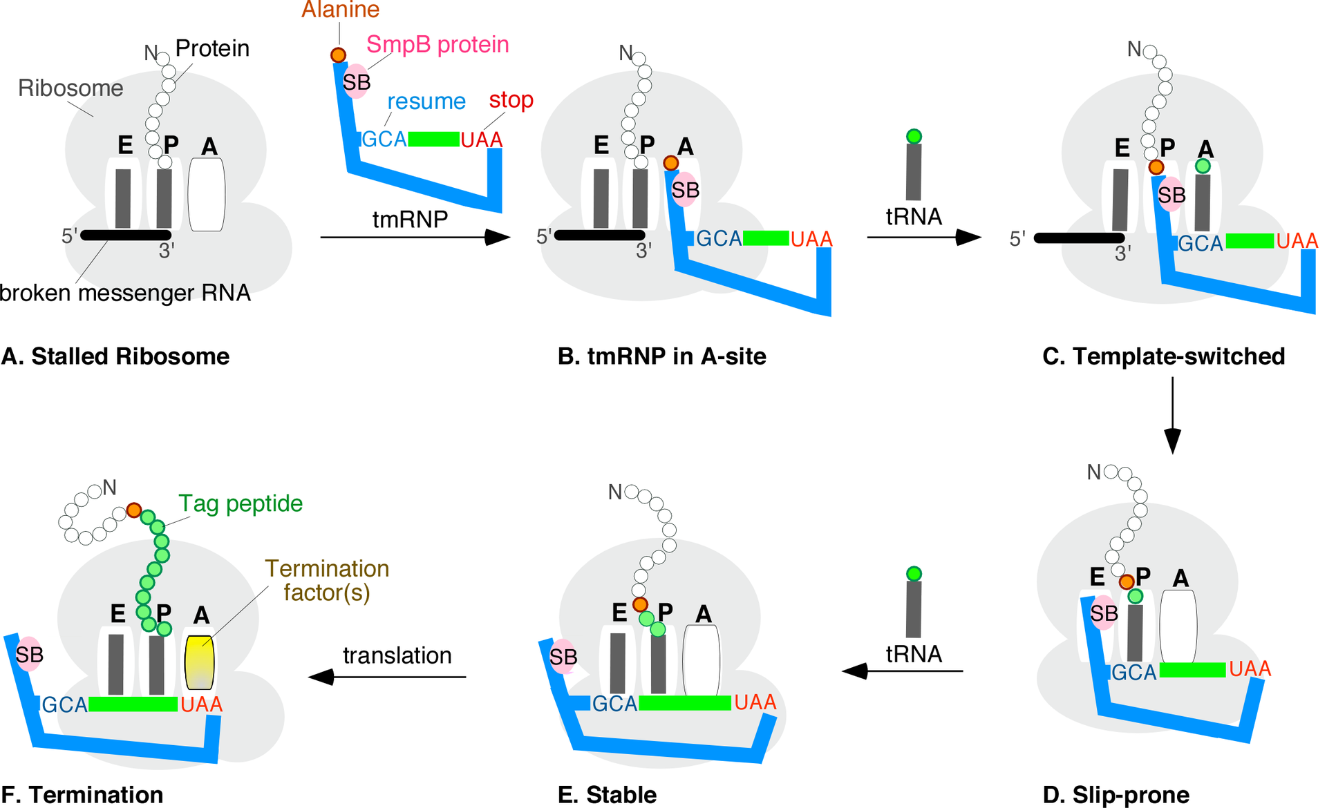trans-Translation stages A through F. A ribosome with its RNA binding sites, designated E, P, and A, is stuck near the 3' end of a broken mRNA. The tmRNP binds to the A-site, allowing the ribosome to switch templates from the broken message onto the open reading frame of the tmRNA via the resume codon (blue GCA). Regular translation eventually resumes. Upon reaching the tmRNA stop codon (red UAA), a hybrid protein with a proteolysis tag (green beads) is released. |