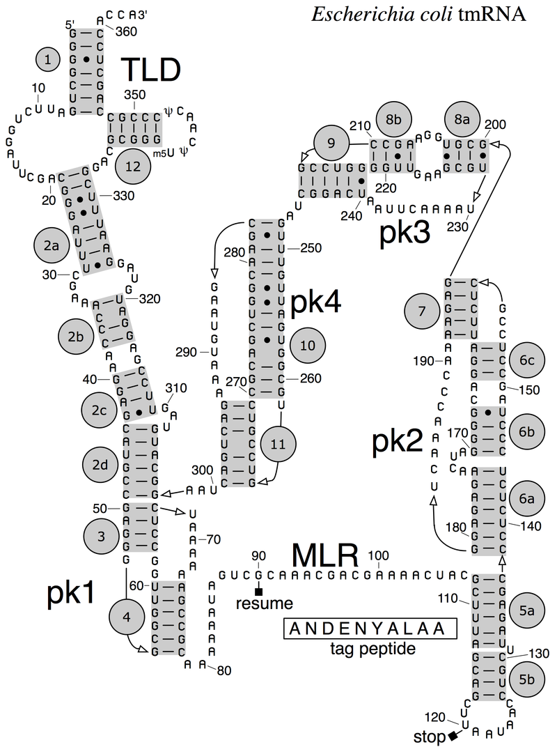 Secondary structure of E. coli tmRNA. Shown are the 5' and 3' ends of the 363-nucleotide RNA chain numbered in increments of ten. Short lines indicate Watson-Crick pairings (G-C and A-U); dots are G-U pairings. Prominent are the tRNA-like domain (TLD), the messenger RNA-like region (MLR), and the four pseudoknots (pk1 to pk4). The MLR encodes the tag peptide between resume and stop codons. RNA helices (numbered one to 12) and their sections (letters) are gray.. |