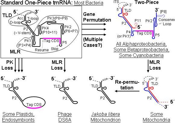 Circularly permuted ssrA has been reported in three major lineages: i) all alphaproteobacteria and the primitive mitochondria of jakobid protists, ii) two disjoint groups of cyanobacteria (Gloeobacter and a clade containing Prochlorococcus and many Synechococcus), and iii) some members of the betaproteobacteria (Cupriavidus and some Rhodocyclales). All produce the same overall two-piece (acceptor and coding pieces) form, equivalent to the standard form nicked downstream of the reading frame. None retain more than two pseudoknots compared to the four (or more) of standard tmRNA.