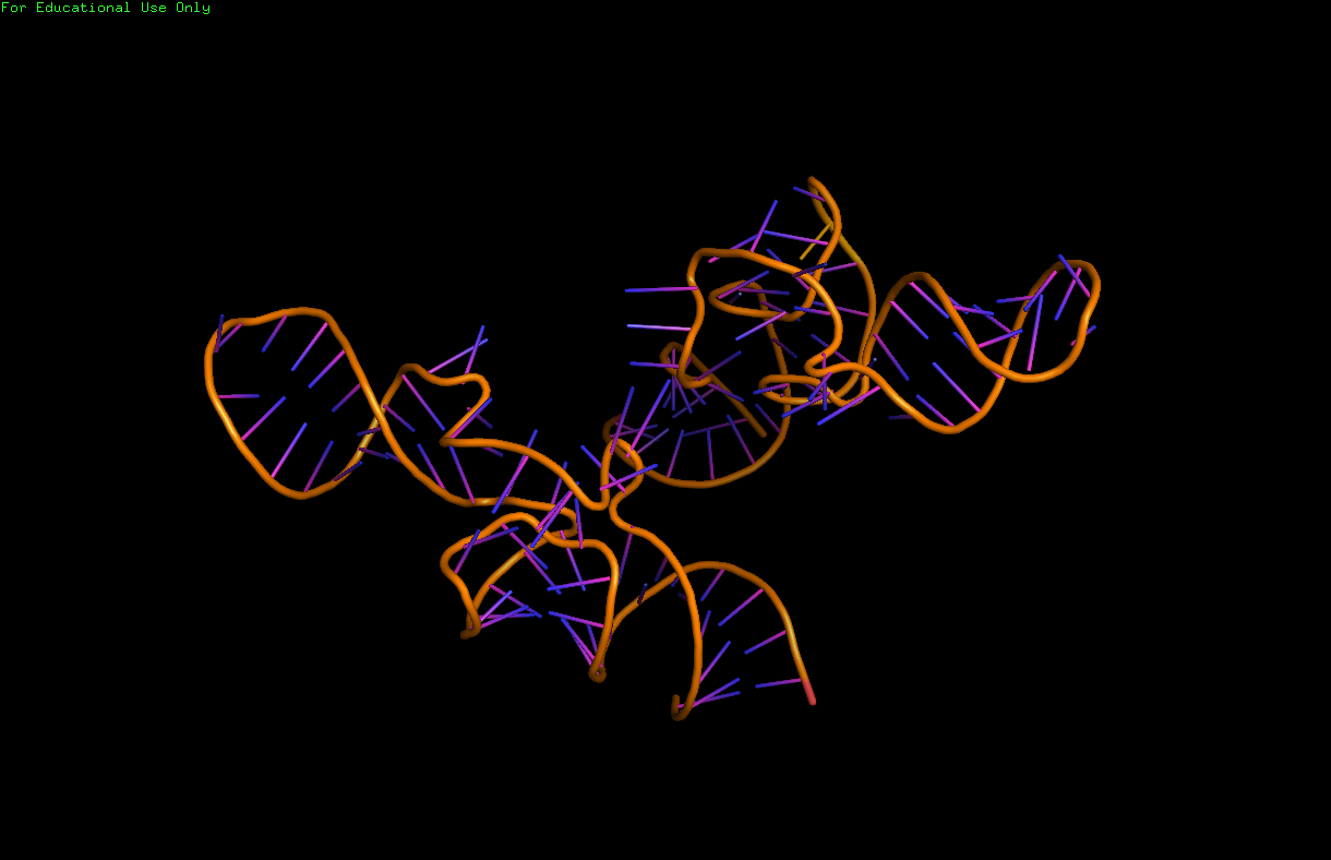 Cartoon ribbon structure of the tRNA-like domain of tmRNA. The domain consists of the 3' and 5' ends of the tmRNA. Image was created using Pymol molecular imaging software for students and data obtained from the RCSB Protein Data Bank file for structure 1J1H: |