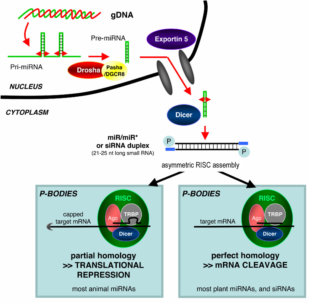 MicroRNAs (miRNAs) are genomically encoded non-coding RNAs that help regulate gene expression, particularly during development. The phenomenon of RNA interference, broadly defined, includes the endogenously induced gene silencing effects of miRNAs as well as silencing triggered by foreign dsRNA. Mature miRNAs are structurally similar to siRNAs produced from exogenous dsRNA, but before reaching maturity, miRNAs must first undergo extensive post-transcriptional modification. A miRNA is expressed from a much longer RNA-coding gene as a primary transcript known as a pri-miRNA which is processed, in the cell nucleus, to a 70-nucleotide stem-loop structure called a pre-miRNA by the microprocessor complex. This complex consists of an RNase III enzyme called Drosha and a dsRNA-binding protein DGCR8. The dsRNA portion of this pre-miRNA is bound and cleaved by Dicer to produce the mature miRNA molecule that can be integrated into the RISC complex; thus, miRNA and siRNA share the same downstream cellular machinery. First, viral encoded miRNA was described in EBV. Thereafter, an increasing number of microRNAs have been described in viruses. VIRmiRNA is a comprehensive catalogue covering viral microRNA, their targets and anti-viral miRNAs (see also VIRmiRNA resource: http://crdd.osdd.net/servers/virmirna/).