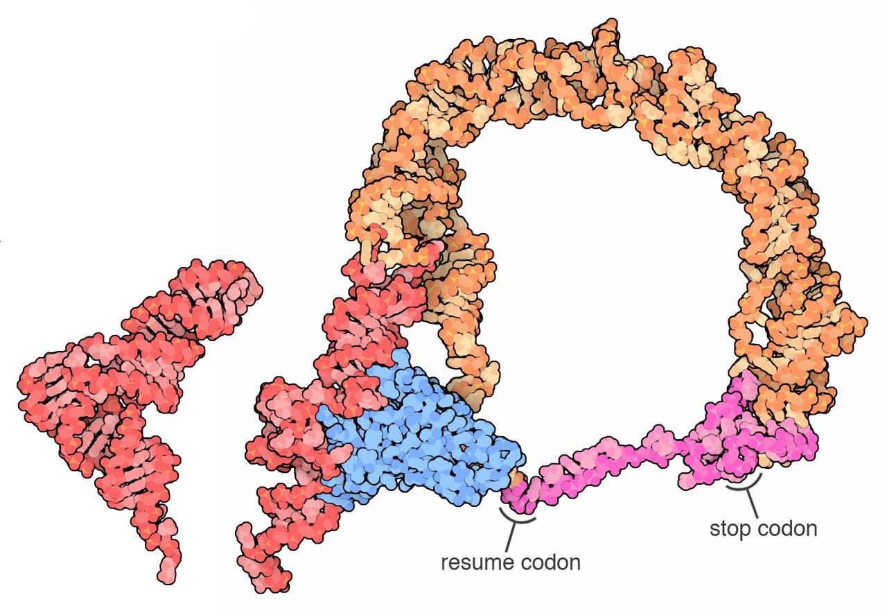 While details of the trans-translation mechanism are under investigation it is generally agreed that tmRNA first occupies the empty A site of the stalled ribosome: Subsequently, the ribosome moves from the 3' end of the truncated messenger RNA onto the resume codon of the MLR, followed by a slippage-prone stage from where translation continues normally until the in-frame tmRNA stop codon is encountered. Trans-translation is essential in some bacterial species, whereas other bacteria require tmRNA to survive when subjected to stressful growth conditions. Depending on the organism, the tag peptide may be recognized by a variety of proteases or protease adapters. |