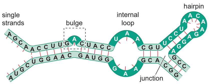 araya giren RNA kesimleri (tümleyici-olmayan) şekilde örneklenen yapıları oluşturmak üzere dışarıya doğru ilmeklenebilir: Bir tümsek (bulge), bir iç ilmek (internal loop), ya da bir toka (hairpin).