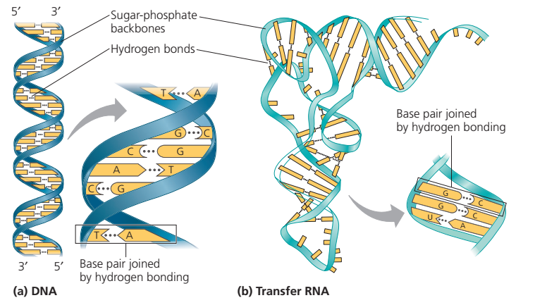 Like DNA, most biologically active RNAs, including mRNA,tRNA,rRNA,snRNAs, and other non-coding RNAs, contain self-complementary sequences that allow parts of the RNA to fold and pair with itself to form double helices. Analysis of these RNAs has revealed that they are highly structured. Unlike DNA, their structures do not consist of long double helices, but rather collections of short helices packed together into structures akin to proteins.