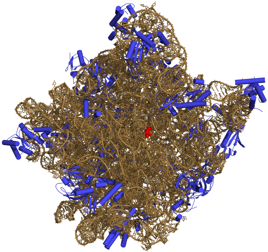 Three-dimensional representation of the 50S ribosomal subunit. Ribosomal RNA is in ochre, proteins in blue. The active site is a small segment of rRNA, indicated in red.