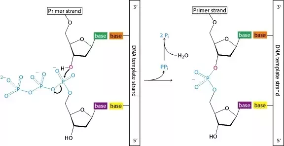 Nükleosidin 3'-hidroksili nükleosid trifosfatın 5' α-fosfatına saldırısı. Uzaklaştırılan öteki iki fosfat bir nükleotidde sonuçlanır.