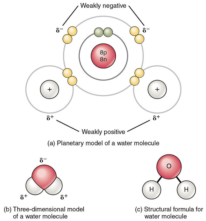 Su molekülünün H atomlarına yakın yanı pozitif yüklü iken, O atomuna en yakın olan yan negatif yüklüdür. Su molekülleri biraraya geldiği zaman birinin pozitif yanı ötekinin negati yanı tarafından çekilir ve moleküllerin tutunması sağlanır. Bu olgu suyun yüksek ısı sığasını, yüzey gerilimini, kohezyonu, adezyonu ve başka özelliklerini açıklar.