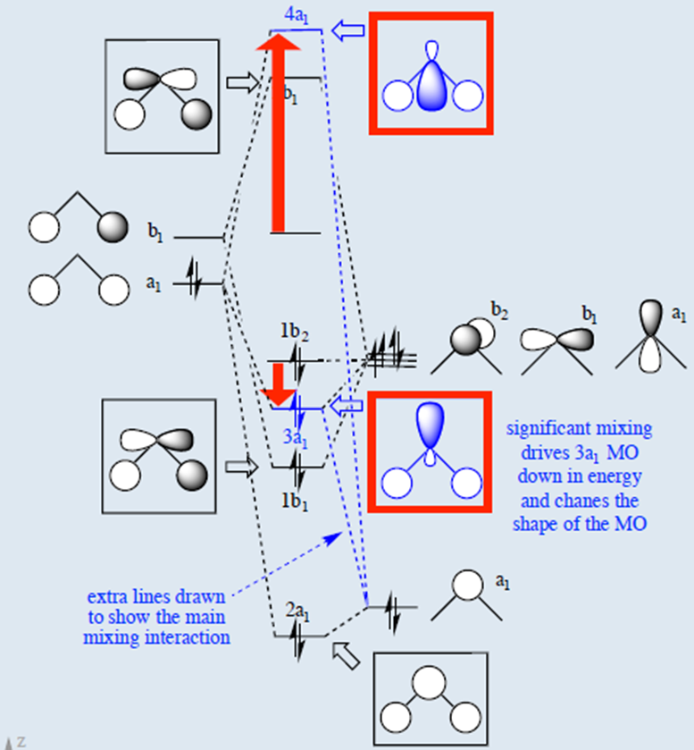 To further distinguish the electron energy differences between the two non-bonding orbitals, orbital mixing can be further performed between the 2p (3a1) orbital on oxygen and the antibonding 4a1 orbital since they are of the same symmetry and close in energy level. Mixing these two orbitals affords two new sets of orbitals as shown in the right boxed in red. Significant mixing of these two orbitals results in both energy changes and changes in the shape of the molecular orbital. There's now significant sp hybridization characterization that is previously not present in the simple MO diagram. Consequently, the two nonbonding orbitals are now at different energies, providing the four distinct energy levels consistent with the PES. Alternatively, instead of mixing the 3a1 nonbonding orbital with the 4a1 antibonding orbital, one can also mix the 3a1 nonbinding orbital with the 2a1 bonding orbital to produce a similar MO diagram of H2O. This alternative H2O MO diagram can also be derived by performing the Walsh diagram treatment via adjusting bonding geometry from linear to bent shape. In addition, these MO diagrams can be generated from bottom up by first hybridizing the oxygen 2s and 2p orbitals (assume sp2 hybridization) and then mixing orbitals of same symmetry. For simple molecules, pictorially generating their MO diagram can be achieved without extensive knowledge of point group theory and using reducible and irreducible representations.