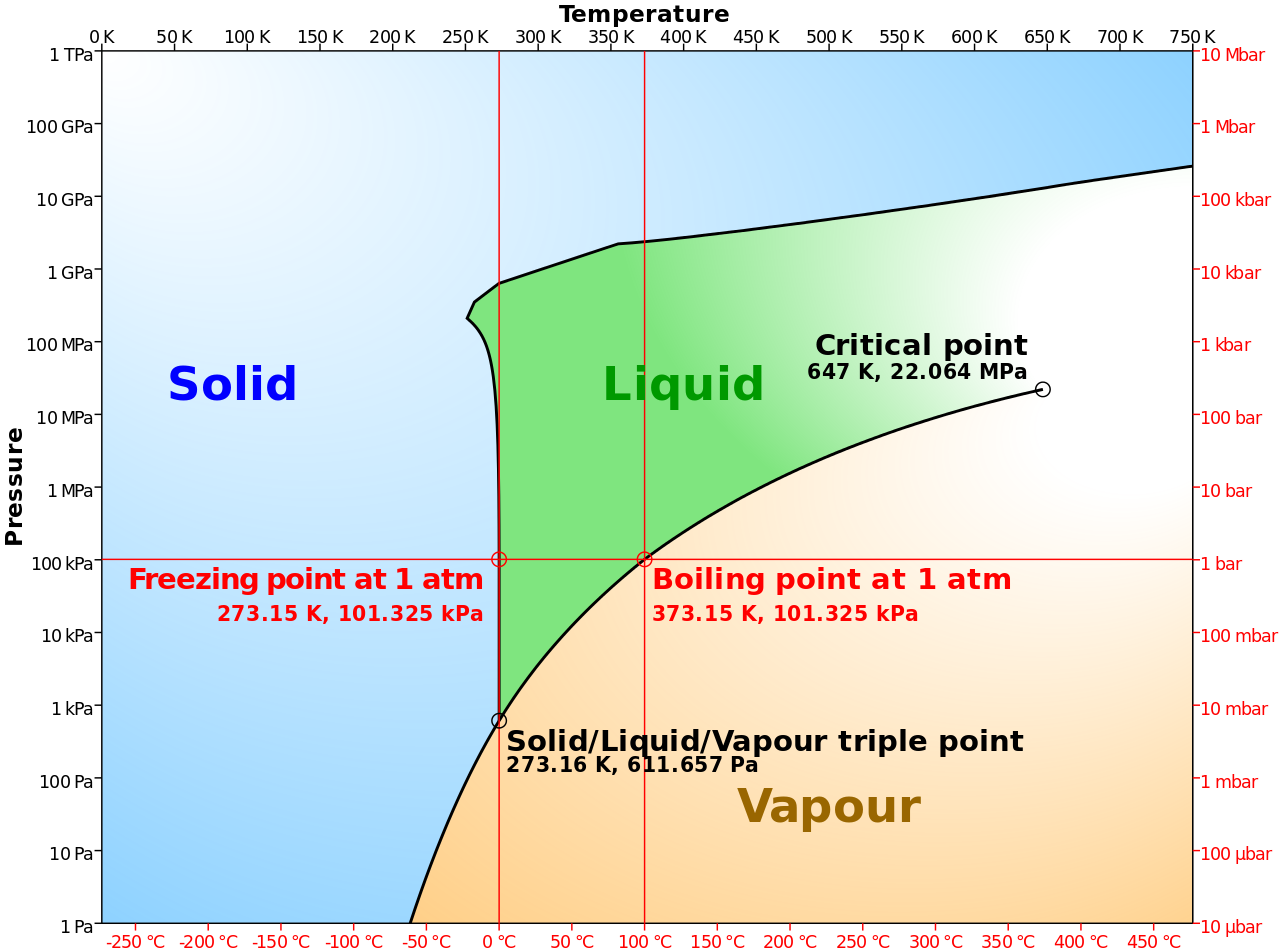 On a pressure/temperature phase diagram (see figure), there are curves separating solid from vapor, vapor from liquid, and liquid from solid. These meet at a single point called the triple point, where all three phases can coexist. The triple point is at a temperature of 273.16 K (0.01 °C) and a pressure of 611.657 pascals (0.00604 atm); it is the lowest pressure at which liquid water can exist. Until 2019, the triple point was used to define the Kelvin temperature scale.
