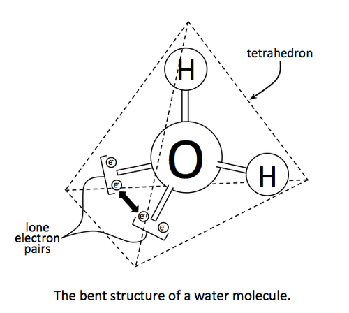 In a water molecule, the hydrogen atoms form a 104.5° angle with the oxygen atom. The hydrogen atoms are close to two corners of a tetrahedron centered on the oxygen. At the other two corners are lone pairs of valence electrons that do not participate in the bonding. In a perfect tetrahedron, the atoms would form a 109.5° angle, but the repulsion between the lone pairs is greater than the repulsion between the hydrogen atoms.