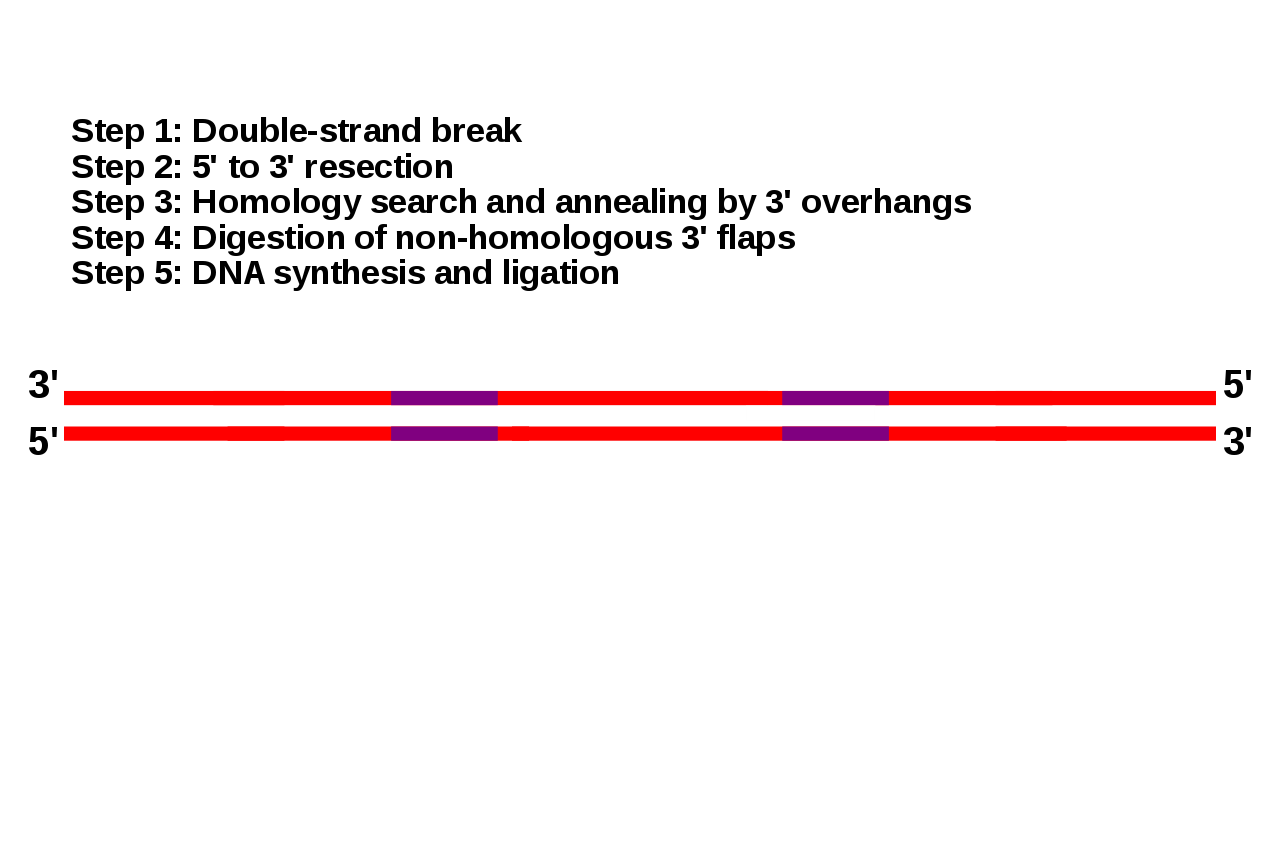Figure 5. The DSBR and SDSA pathways follow the same initial steps, but diverge thereafter. The DSBR pathway most often results in chromosomal crossover (bottom left), while SDSA always ends with non-crossover products (bottom right). |
