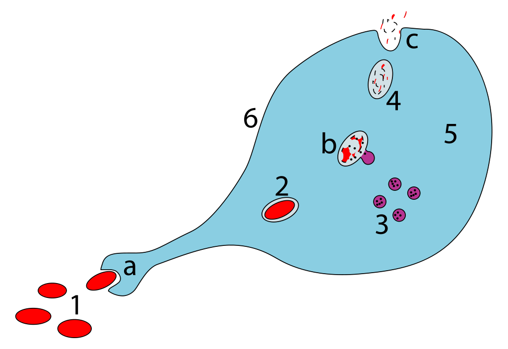 Cartoon representation of a proteasome. Its active sites are sheltered inside the tube (blue). The caps (red; in this case, 11S regulatory particles) on the ends regulate entry into the destruction chamber, where the protein is degraded..