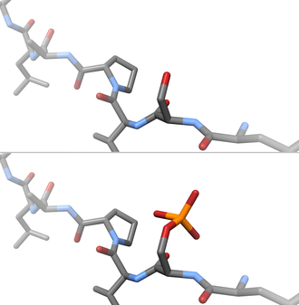 Protein phosphorylation is a reversible post-translational modification of proteins in which an amino acid residue is phosphorylated by a protein kinase by the addition of a covalently bound phosphate group. Phosphorylation alters the structural conformation of a protein, causing it to become activated, deactivated, or modifying its function. Approximately 13000 human proteins have sites that are phosphorylated.