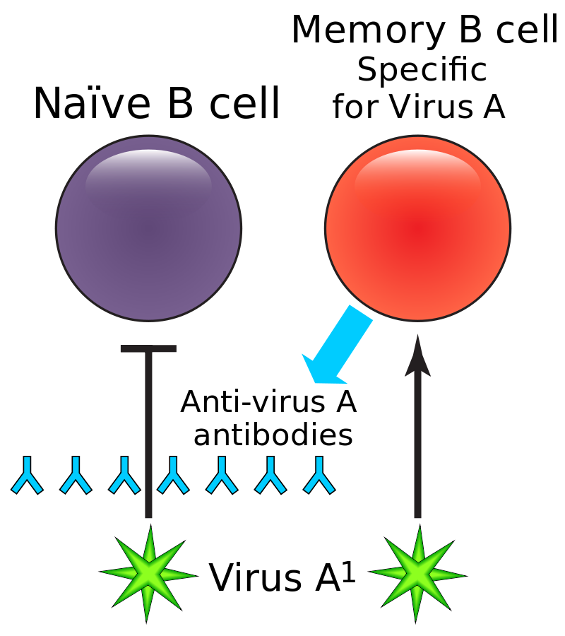 A high affinity memory B cell, specific for Virus A, is preferentially activated by a new strain, Virus A1, to produce antibodies that ineffectively bind to the A1 strain. The presence of these antibodies inhibits activation of a naive B cell that produces more effective antibodies against Virus A1. This effect leads to a diminished immune response against Virus A1, and heightens the potential for serious infection.