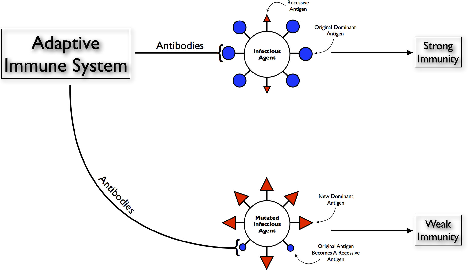 The original antigenic sin: When the body first encounters an infection it produces effective antibodies against its dominant antigens and thus eliminates the infection. But when it encounters the same infection, at a later evolved stage, with a new dominant antigen, with the original antigen now being recessive, the immune system will still produce the former antibodies against this old "now recessive antigen" and not develop new antibodies against the new dominant one, this results in the production of ineffective antibodies and thus a weak immunity..