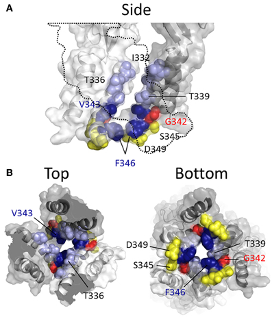 Mapping P2X2R TM2 substituted cysteine side chains capable of coordinating Cd2+ in the open channel state.
