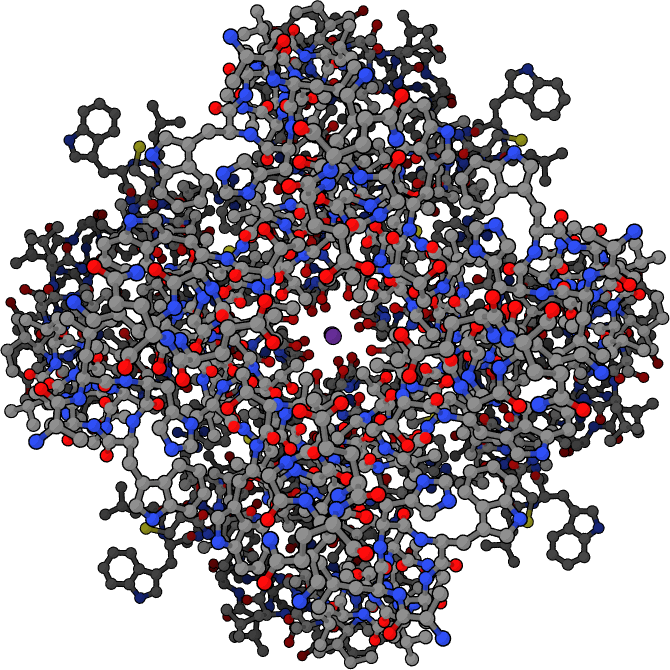 A representation of the 3D structure of the protein myoglobin showing turquoise α-helices. This protein was the first to have its structure solved by X-ray crystallography. Toward the right-center among the coils, a prosthetic group called a heme group (shown in gray) with a bound oxygen molecule (red).