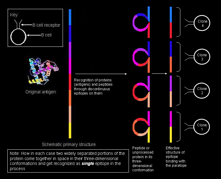 The part of the antigen to which the paratope binds is called an epitope. This can be mimicked by a mimotope. The figure given on the right hand side depicts the antibody commonly found on a B leukocyte. The engraved inner portions of idiotype (encircled region no.5 in the above diagram) is the paratope where the epitope of the antigen binds. (W)