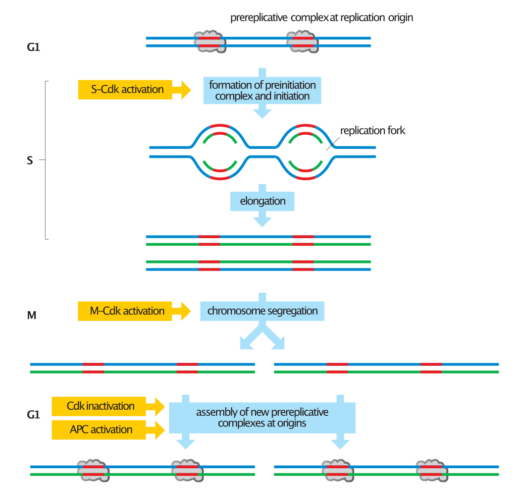 The origin of replication (also called the replication origin) is a particular sequence in a genome at which replication is initiated. Propagation of the genetic material between generations requires timely and accurate duplication of DNA by semiconservative replication prior to cell division to ensure each daughter cell receives the full complement of chromosomes. This can either involve the replication of DNA in living organisms such as prokaryotes and eukaryotes, or that of DNA or RNA in viruses, such as double-stranded RNA viruses. Synthesis of daughter strands starts at discrete sites, termed replication origins, and proceeds in a bidirectional manner until all genomic DNA is replicated. Despite the fundamental nature of these events, organisms have evolved surprisingly divergent strategies that control replication onset. Although the specific replication origin organization structure and recognition varies from species to species, some common characteristics are shared.(W)