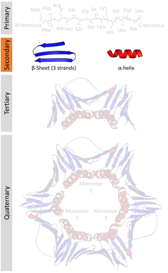 Protein secondary structure is the three dimensional form of local segments of proteins. The two most common secondary structural elements are alpha helices and beta sheets, though beta turns and omega loops occur as well. Secondary structure elements typically spontaneously form as an intermediate before the protein folds into its three dimensional tertiary structure.