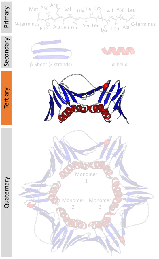 Protein tertiary structure is the three dimensional shape of a protein. The tertiary structure will have a single polypeptide chain "backbone" with one or more protein secondary structures, the protein domains.Amino acidside chains may interact and bond in a number of ways. The interactions and bonds of side chains within a particular protein determine its tertiary structure. The protein tertiary structure is defined by its atomic coordinates. These coordinates may refer either to a protein domain or to the entire tertiary structure. A number of tertiary structures may fold into a quaternary structure. (W)
