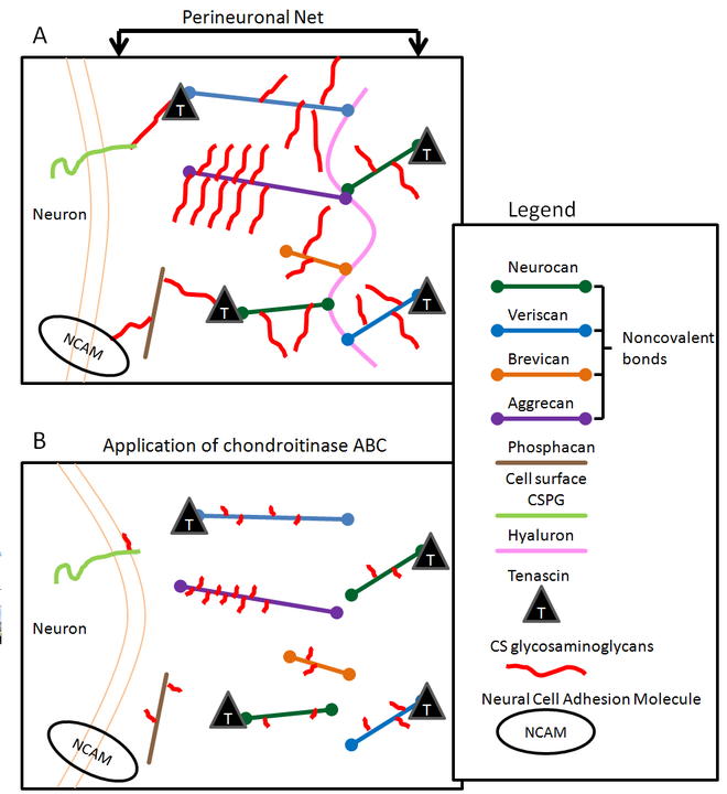 A. Perineuronal nets are made of chondroitin sulfate proteoglycans (CSPGs). Here, the CSPGs neurocan, versican, brevican, and aggrecan are noncovalently bonded to hyaluronan. Associations occur between other CSPGs through tenascin (T, triangles). Tenascin, in turn, binds to CS glycosaminoglycans (red lines) as well as cell surface CSPGs. Phosphacan can also bind to cell surface receptors such as NCAM. B. Application of chondroitinase ABC (ChABC) degrades all the CS glycosaminoglycans (red lines) as well as hyaluronan (pink line), causing major disruptions in the structure of the perineuronal net. These disruptions may allow axons to penetrate the vacated space and permit restoration of neural plasticity.