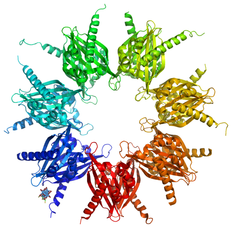 Structure of a proteasome. Its active sites are inside the tube (blue) where proteins are degraded.