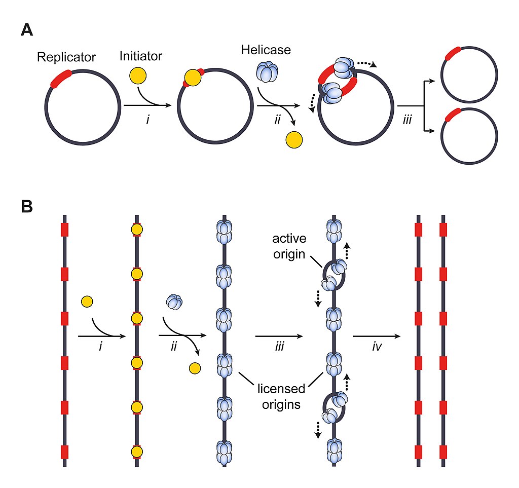 Models for bacterial (A) and eukaryotic (B) DNA replication initiation. A) Circular bacterial chromosomes contain a cis-acting element, the replicator, that is located at or near replication origins. i) The replicator recruits initiator proteins in a DNA sequence-specific manner, which results in melting of the DNA helix and loading of the replicative helicase onto each of the single DNA strands (ii). iii) Assembled replisomes bidirectionally replicate DNA to yield two copies of the bacterial chromosome. B) Linear eukaryotic chromosomes contain many replication origins. Initiator binding (i) facilitates replicative helicase loading (ii) onto duplex DNA to license origins. iii) A subset of loaded helicases is activated for replisome assembly. Replication proceeds bidirectionally from origins and terminates when replication forks from adjacent active origins meet (iv)..