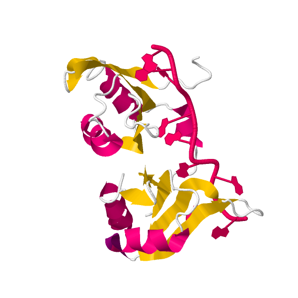 Assembled human PCNA (PDB 1AXC), a sliding DNA clamp protein that is part of the DNA replication complex and serves as a processivity factor for DNA polymerase. The three individual polypeptide chains that make up the trimer are shown..