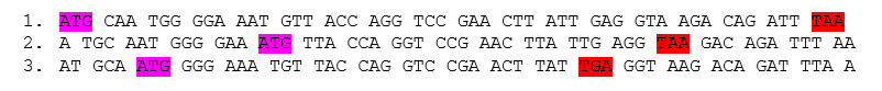 Example of a six-frame translation. The nucleotide sequence is shown in the middle with forward translations above and reverse translations below. Two possible open reading frames with the sequences are highlighted.