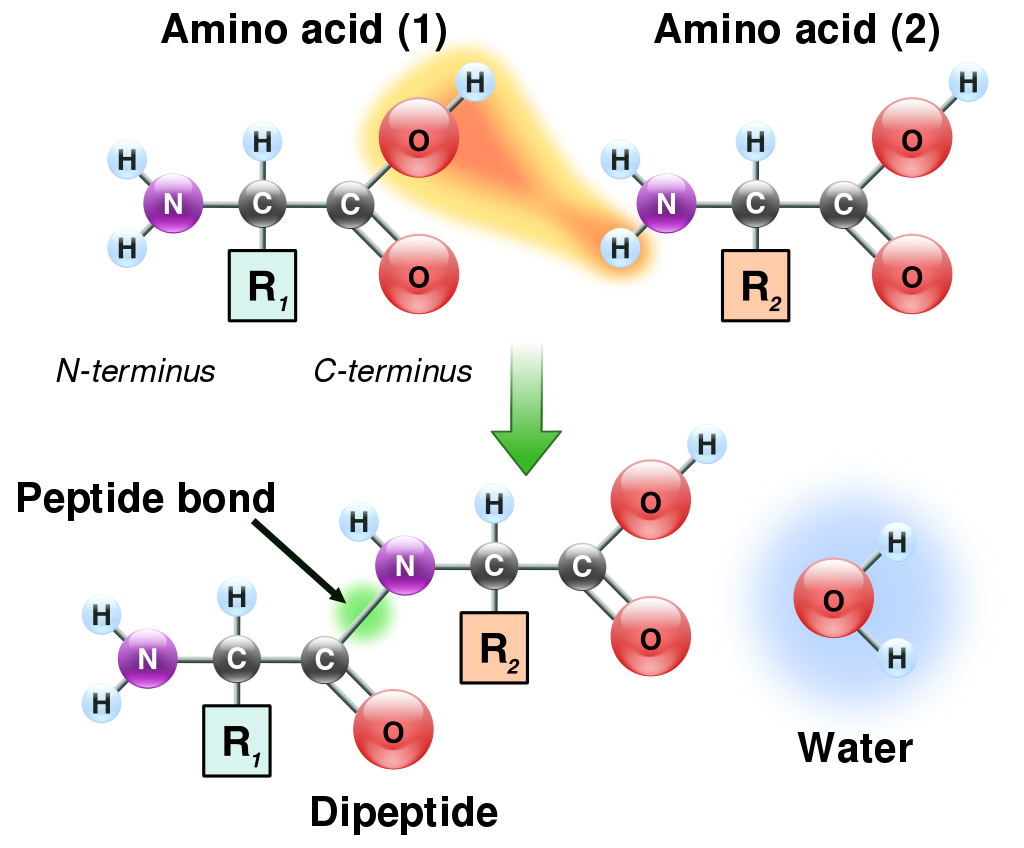 When two amino acids form a dipeptide through a peptide bond it is a type of condensation reaction. In this kind of condensation, two amino acids approach each other, with the non-side chain (C1) carboxylic acidmoiety of one coming near the non-side chain (N2) amino moiety of the other. One loses a hydrogen and oxygen from its carboxyl group (COOH) and the other loses a hydrogen from its amino group (NH2). This reaction produces a molecule of water (H2O) and two amino acids joined by a peptide bond (-CO-NH-). The two joined amino acids are called a dipeptide.