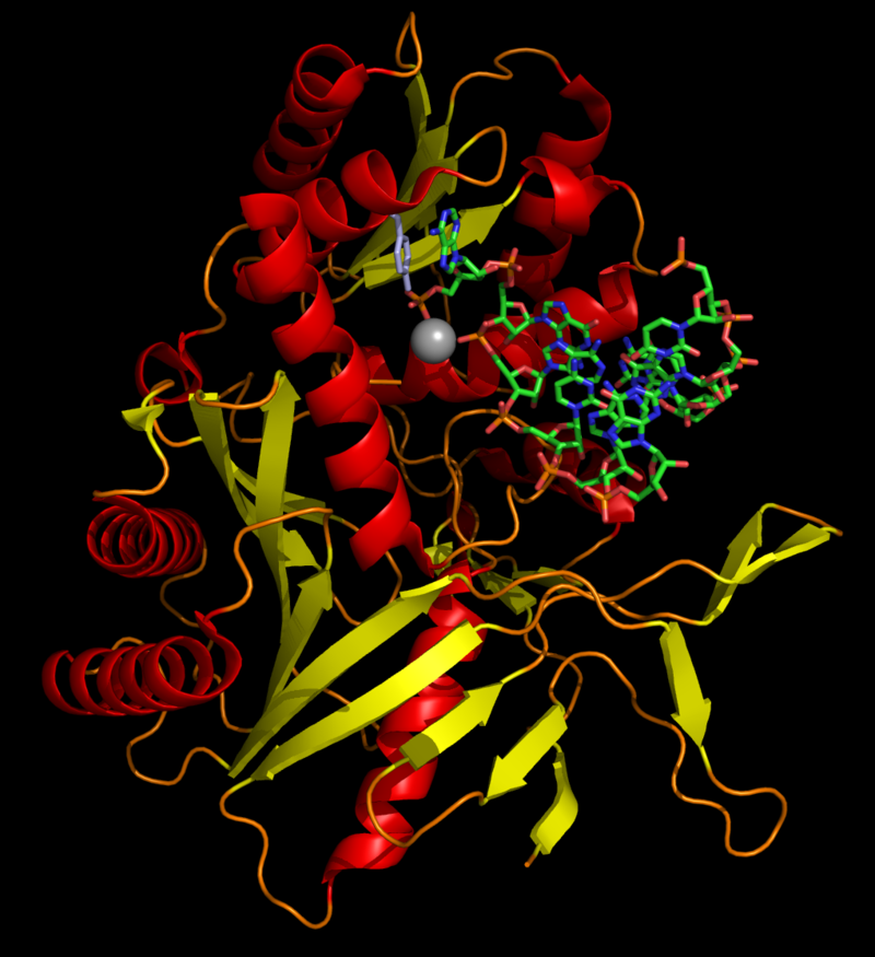 The structure of a protease (TEV protease) complexed with its peptide substrate in black with catalytic residues in red.(PDB:1LVB).